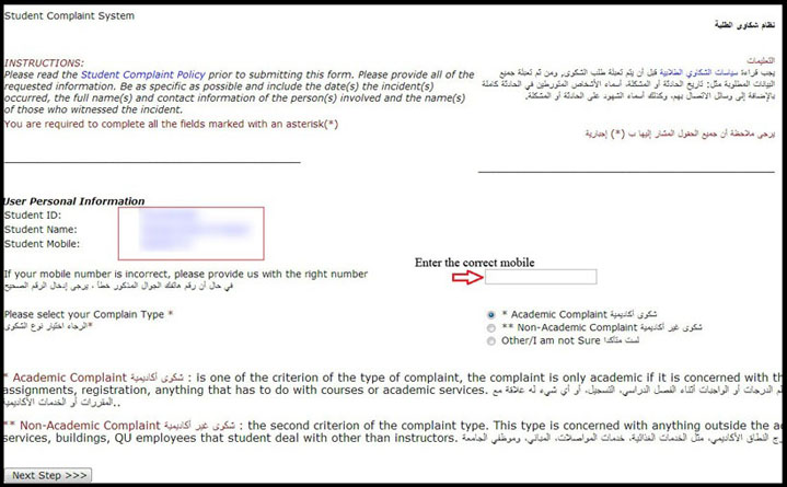 - بعد أن تظهر لك صفحة نظام شكاوي الطلبة (كما هو موضح بالأسفل)، يجب قراءة "سياسات الشكاوي الطلابية" قبل تعبئة جميع البيانات المطلوبة، كما يرجى اختيار نوع الشكوى: أكاديمية/ غير أكاديمية/ لست متأكداً (في حال عدم التأكد من تصنيف الشكوى)، ثم الضغط على Next Step. يرجى ملاحظة أنه في أي وقت يمكنك الرجوع إلى الصفحة السابقة من خلال الضغط على Return to Previous.