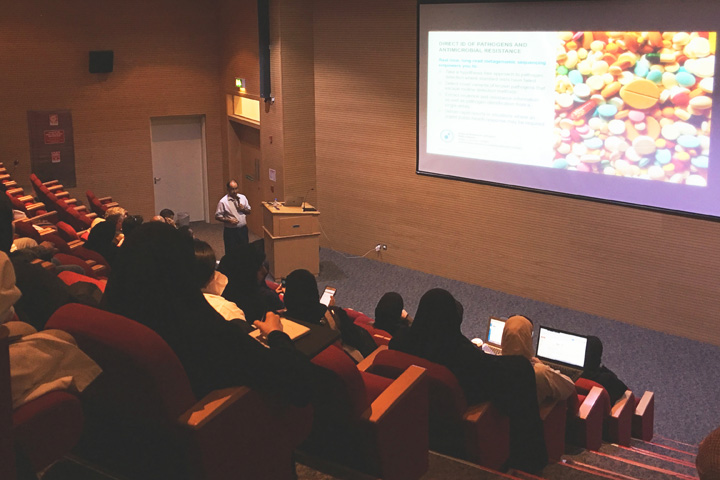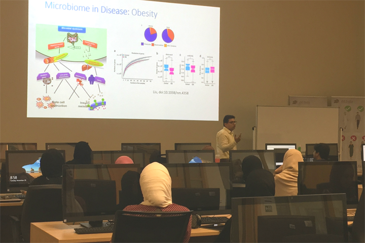 The Biomedical Research Center (BRC) at Qatar University (QU) held on November 19-20 a workshop on “Next Generation Sequencing (NGS) Data Analysis Workshop”. The primary goal of this workshop was to introduce participants with NGS and sequence assembly. Around 30 individuals attended the workshop representing various academic institutions and labs. Dr. Asmaa Al Thani, the Dean of College of Health Science and Director of the Biomedical Research Center at QU gave the opening speech, where she welcomed the attendees and talked about the importance of NGS data analysis, genome assembly and statistical interpretation for biomedical researchers. The workshop hosted two speakers from SIDRA: Dr. Jithesh Puthen, Investigator of Translational Bioinformatics and Lead of the Bioinformatics Core, and Eng. Hakeem Almabrazi, Senior Software Architect. Dr. Muhammad Sohail, Research Associate, was the speaker from the BRC. Dr. Jithesh introduced NGS data analysis (background) to trainees in the theoretical session. Dr. Hakeem later demonstrated Linux and quality control in genome sequencing in the practical hands-on session. On the second day, Dr. Muhammad gave a microbiome lecture and demonstrated QIIME2 in the practical session that followed. Future workshops related to NGS are under consideration due to the positive feedback from trainees.
