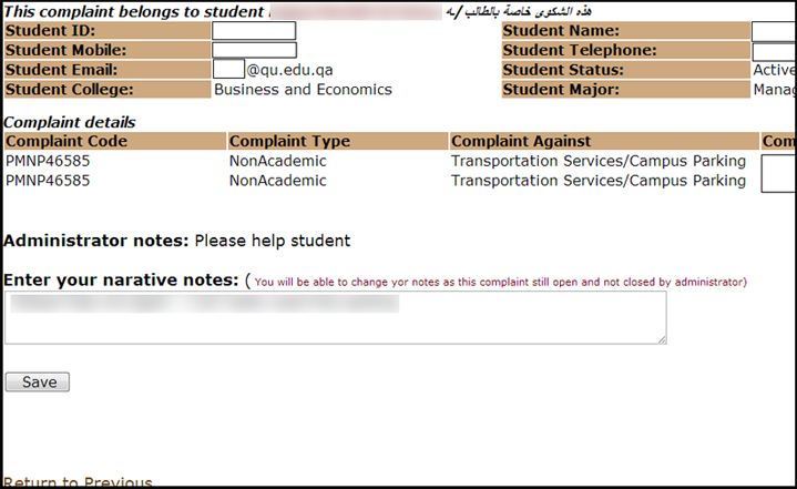 - To check your complaint status, please go to QU Services, then click Complaint System to Check Complaint Status. A generated report will indicate the complaint code, type, against whom, individual involved, status of the complaint and the date of the incident as shown: