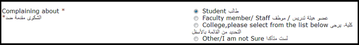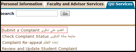 - Go to QU Services tab then Complaint System.